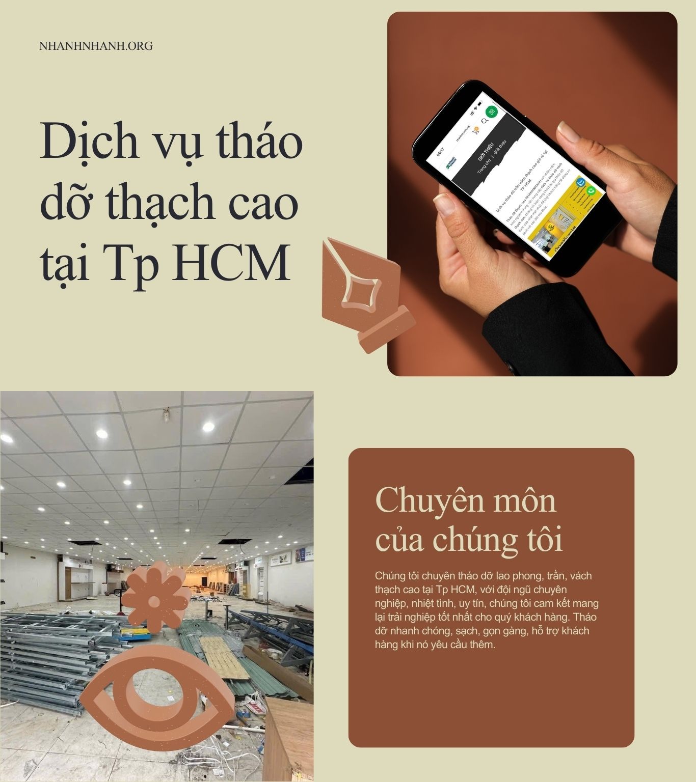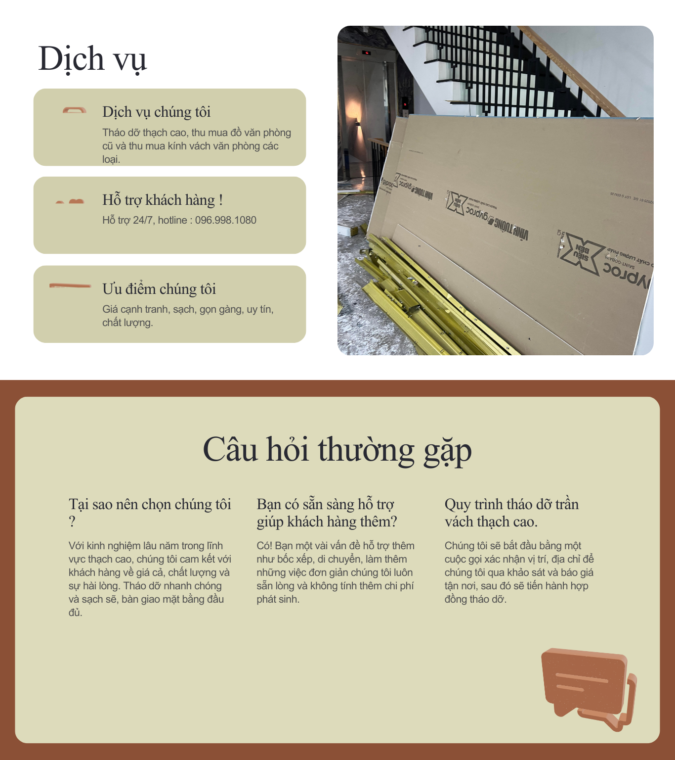 - Toàn diện: Nhận tháo dỡ mọi loại trần vách thạch cao (nổi, chìm), vách ngăn, bao gồm cả việc xử lý phế thải đúng quy định, trả lại mặt bằng sạch sẽ.